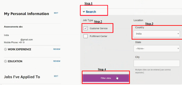 - Click on “Customer Service”, Select “Location” as “India”, Click on “Filter Jobs”