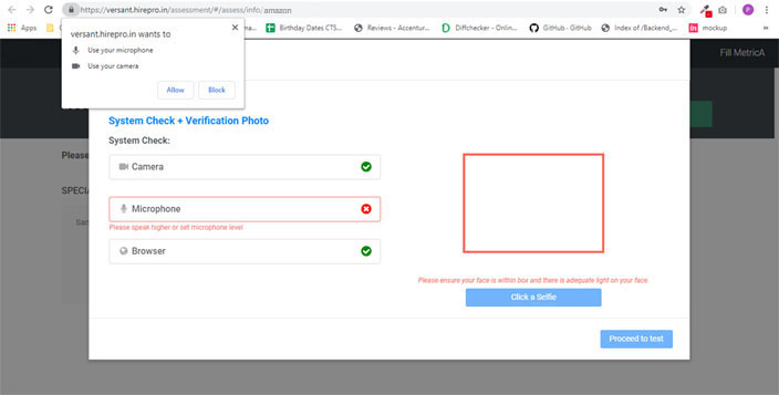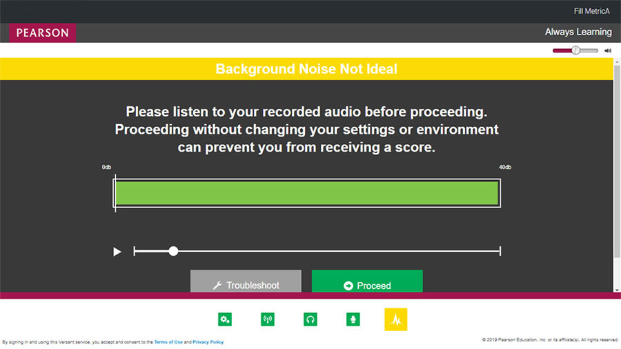 When any noise from the surrounding is audible, system might prevent you from receiving a score. Please make sure you are in a quiet place while taking the test.